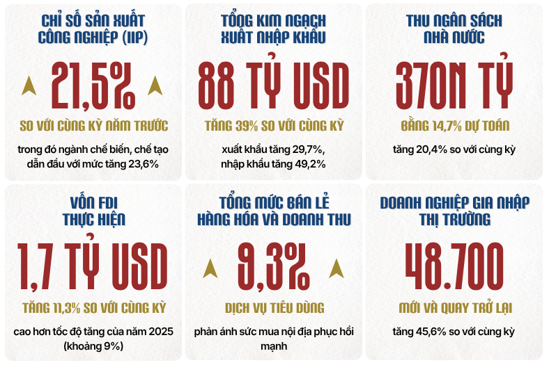 - Tổng mức bán lẻ hàng hóa và doanh thu dịch vụ tiêu dùng tăng 9,3%, phản ánh sức mua nội địa phục hồi mạnh