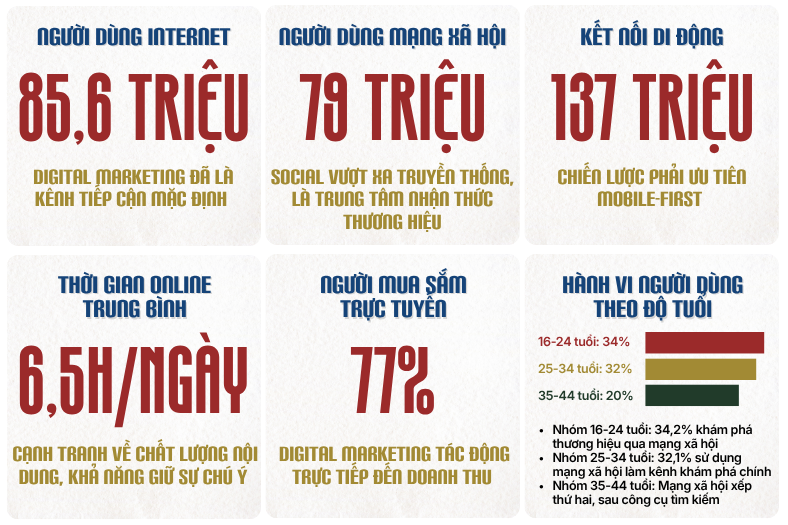 | Người dùng Internet | 85,6 triệu | Digital marketing đã là kênh tiếp cận mặc định |