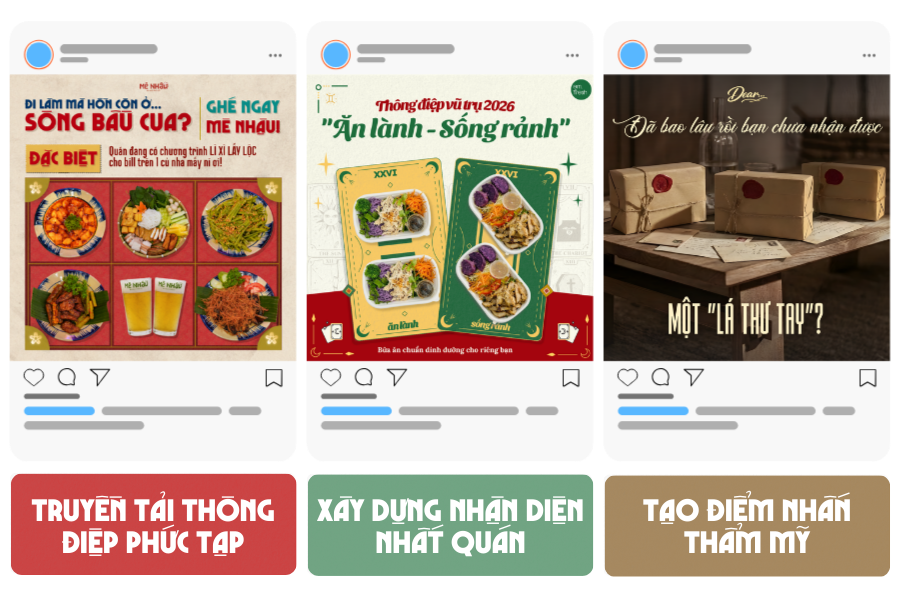 Sự nhất quán này tạo nên chuyên nghiệp và ghi dấu ấn trong tâm trí khách hàng. Một fanpage chỉ toàn ảnh chụp, dù đẹp đến đâu, cũng khó xây dựng được nhận diện mạnh mẽ như khi có sự hỗ trợ của thiết kế đồ họa.