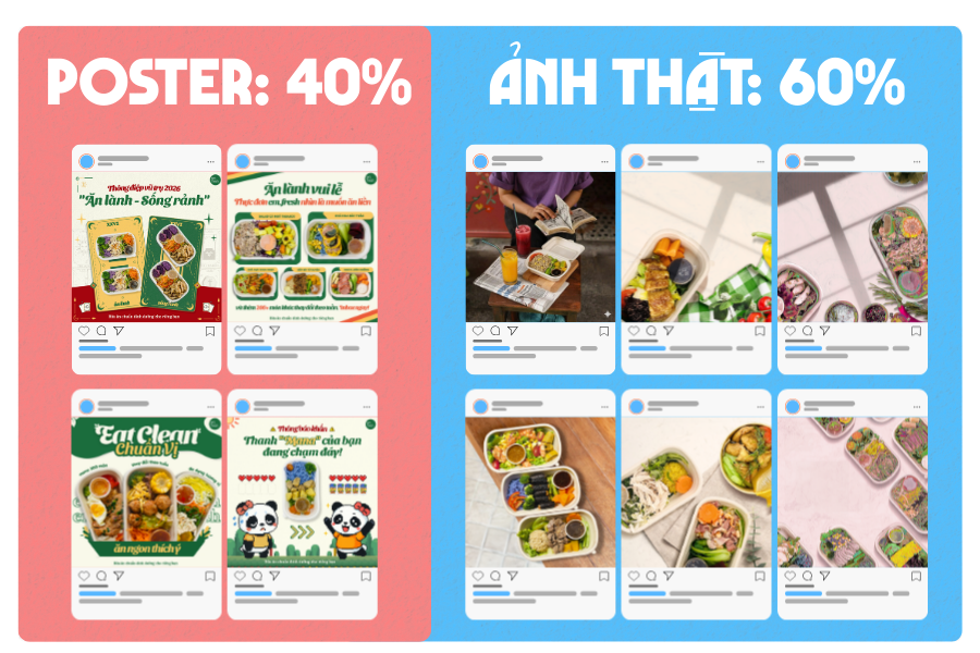 Không có công thức cố định cho mọi doanh nghiệp, nhưng tỷ lệ tham khảo phổ biến là 60% hình thật – 40% design post . Tỷ lệ này đảm bảo:
